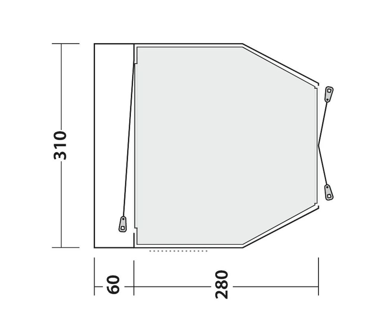 The awning fits vehicles with an attachment height of between 180 and 205mm, making it a great choice for small campervans and MPVs. Curtained windows, a large front and rear door, side air vents and an optional toggle-up ground sheet make it ideal for weekend stays and touring use.