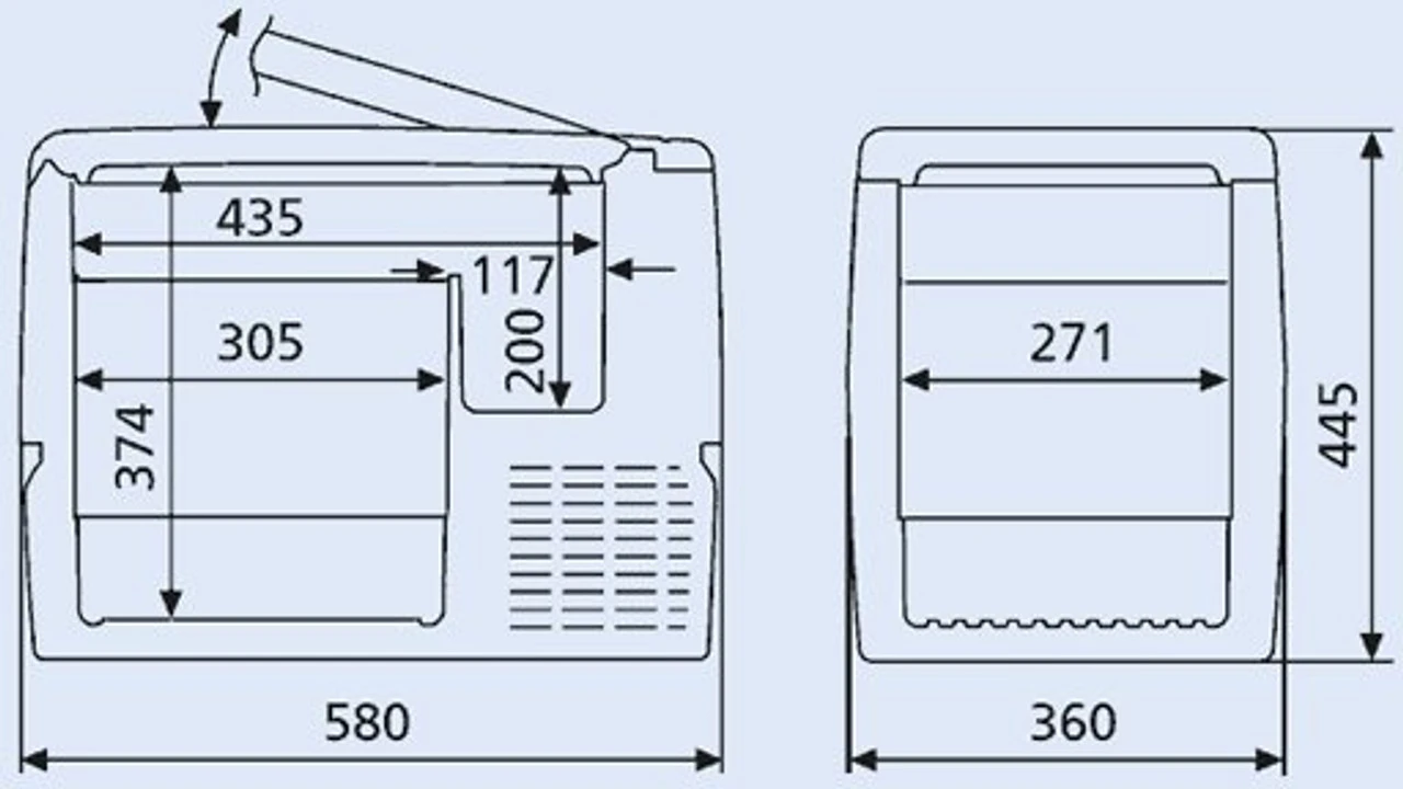 The Waeco CF40 Fridge Freezer, one of the CoolFreeze compact units offering superb portability with good internal space of 37 litres gross capacity, comprising of 31 Litres for refrigeration or deep-freezing and 6 litres for fresh food that can hold 2 litre bottles upright.